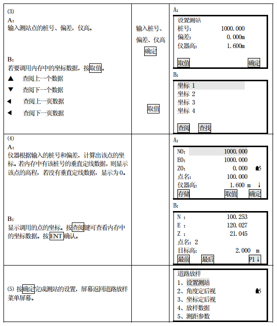 測站的設(shè)置可以通過鍵盤或從儀器內(nèi)存讀取的方式輸入。鍵盤輸入是按“樁號、偏差” 的形式輸入的,而從內(nèi)存中讀取的是 N、E、Z 坐標形式。